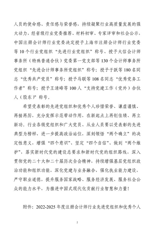 近日,收到中共中國注冊會計師行業(yè)委員會文件《關(guān)于表彰2022-2025年度注冊會計師行業(yè)先進(jìn)黨組織和優(yōu)秀個人的決定》,我所主任會計師吳林海同志榮獲注冊會計師行業(yè)“優(yōu)秀黨務(wù)工作者”稱號。 此次榮獲“優(yōu)秀黨務(wù)工作者”稱號,不僅是對其個人工作的認(rèn)可,也是對我所黨建工作的高度肯定。 我所將以此次獲獎為契機(jī),進(jìn)一步加強(qiáng)黨建工作,深化黨建與業(yè)務(wù)融合,提升服務(wù)質(zhì)量,堅守職業(yè)道德,不斷增強(qiáng)服務(wù)國家戰(zhàn)略、服務(wù)經(jīng)濟(jì)發(fā)展、服務(wù)社會公眾的能力。 附件:
